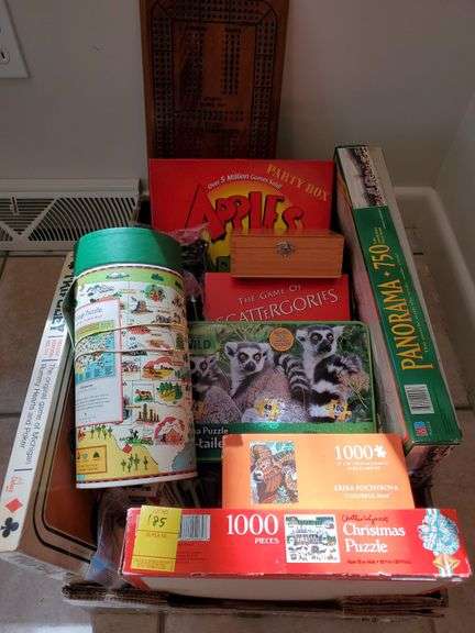 LOT 185 - Drueke model 1977 club cribbage masterboard, assorted puzzles, apples to apples party game, scattergories, playing cards, Domino's and more.