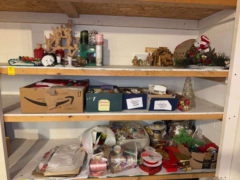 LOT 162 - Large Assortment of Christmas Decor including Ornaments, Nativity Sets, Tree Toppers, Candles, Candelabra, Ribbons, Bows, Linens, and more. 3 Shelves