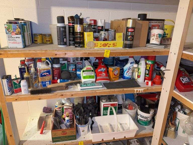 LOT 167 - (3) Shelves of Painting and Cleaning Supplies including spray paints, primers, paint thinners, degreasers, baking soda, electric paint sprayer, brushes, rollers, and more