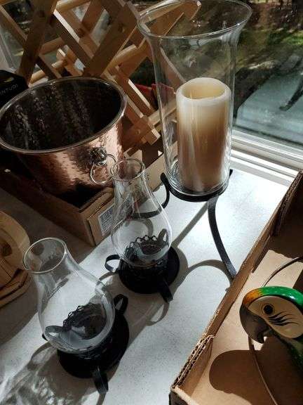 LOT 196A - Pillar candle holder with bent metal frame, two hurricane lamp candle holders