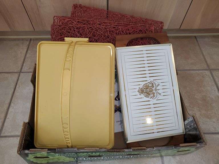 LOT 197A - Woven placemats, vintage Tupperware cake taker, vintage warming tray, cloth placemats and tablecloths. See all photos