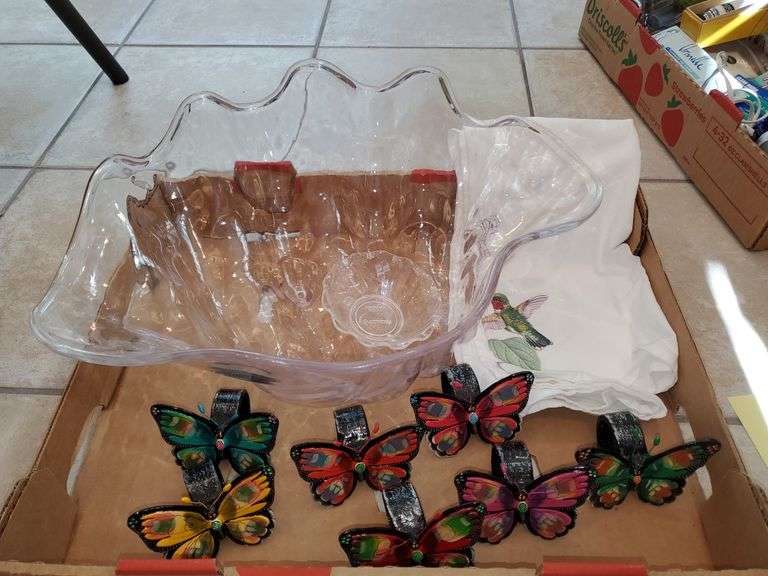 LOT 198A - Larger acrylic clamshell serving bowl, ceramic butterfly napkin ring holders, hummingbird tea towel