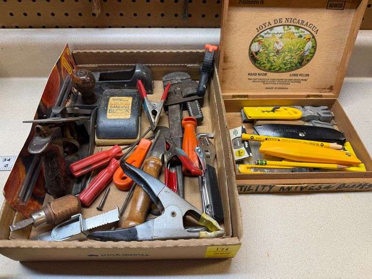 LOT 171 - Utility Knives, Clamps, Pipe Wrench, Planer, Sanding Block, Crescent Wrench, and more