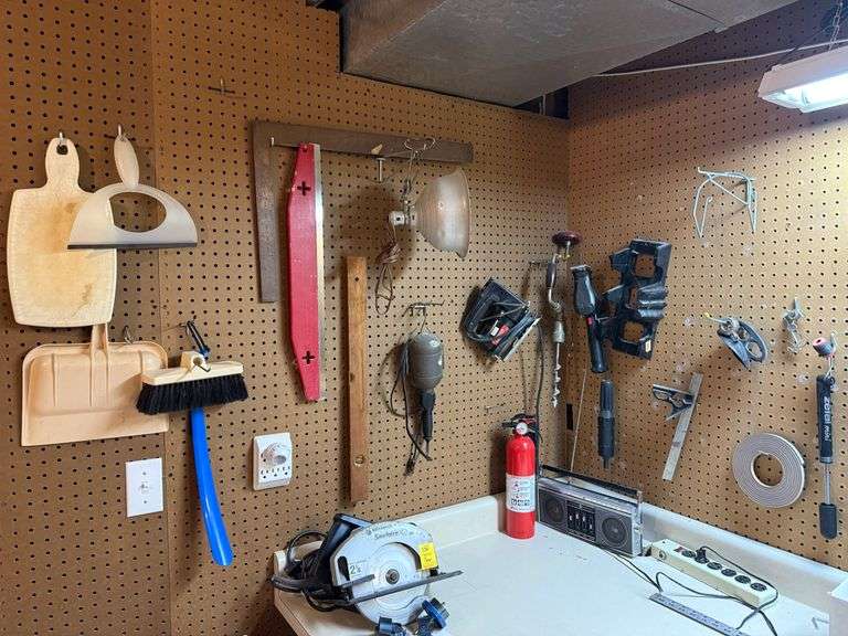 LOT 174 - Pegboard Contents Including broom, dustpan, fire extinguisher, trouble light, hand drill, sabre saw, square, and more