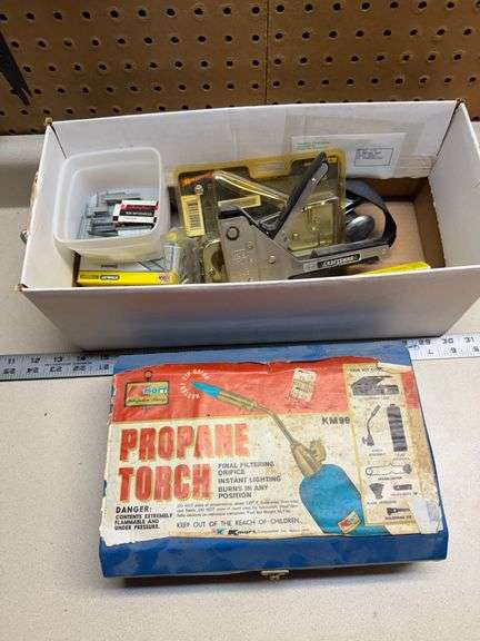 LOT 175 - Propane Torch, Staple Gun, Staples, and Aluminum Measuring Stick