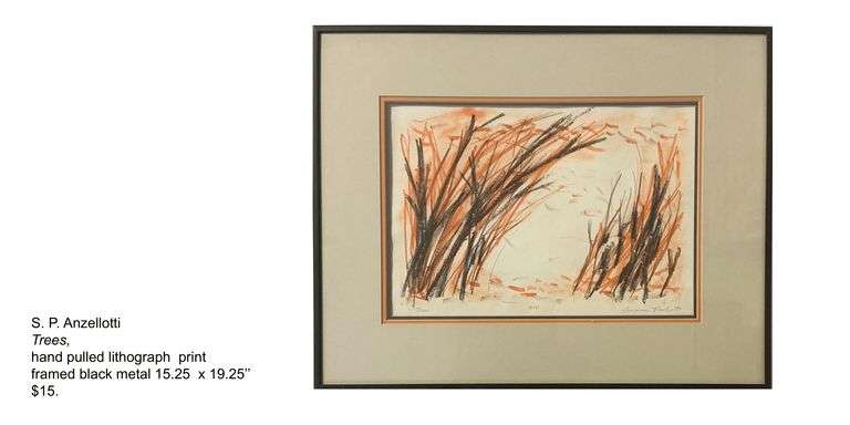 LOT 38 - S. P. Anzellotti, trees, hand-pooled lithograph print, black metal frame, 15.25 x 19.25. originally priced at $15