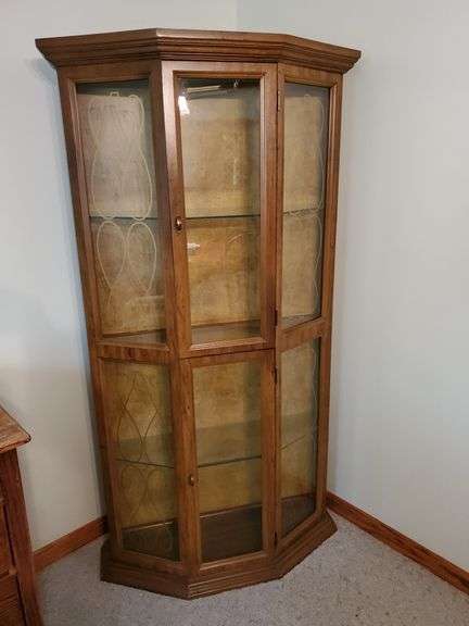 LOT 22 - Three shelf lighted curio cabinet with brass hardware measures 39 in W X 15 in D X 72 in H.