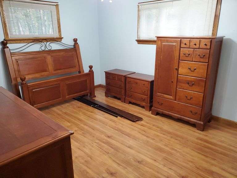 LOT 28 - Beautiful (5) piece bedroom suite features queen size bed , mirrored dresser with beveled edged mirror (58 in W X 18 in DX 81 in H), armoire (38 in w x 18 in D X 58 in H), and two matching nightstands (26 in WX16 in D X 26 in H. All pieces feature wood beaded accents. Made in the USA.