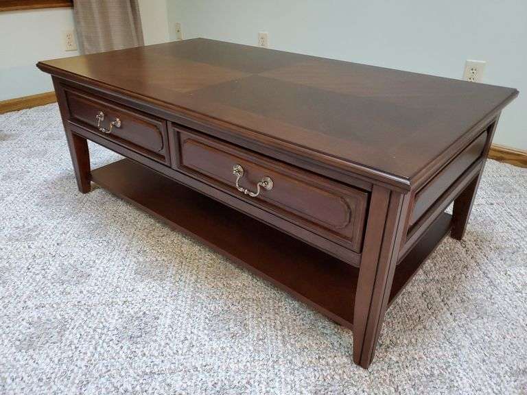 LOT 36 - Dark wood coffee table on casters with two drawers and lower storage. Measures 50 in W X 28 in D X 19 in H. Very nice condition. Living room