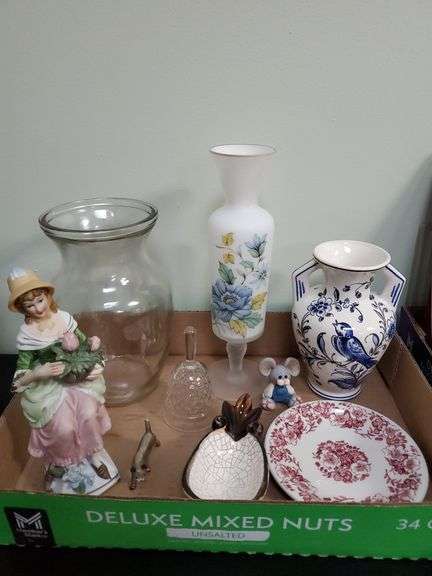 LOT 50 - Syracuse China maroon floral printed plate, Puerto Rico trinket dish, Victorian lady porcelain figure, ceramic vase with bird and floral design, footed vase with floral design, Crystal Bell and more. Living room