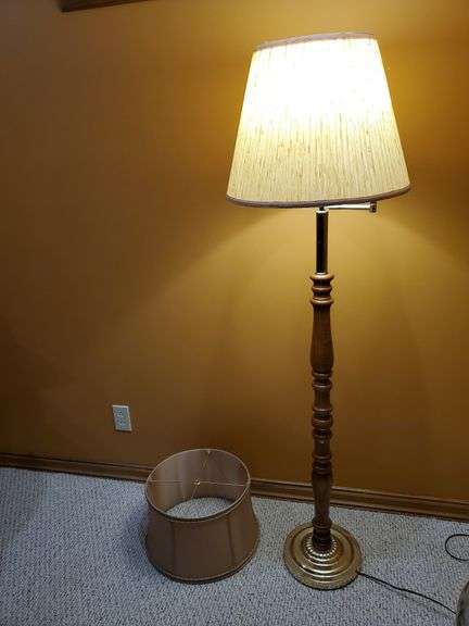 LOT 60 - 60-in tall swing arm, turned wood spindle floor lamp with two shades. Basement