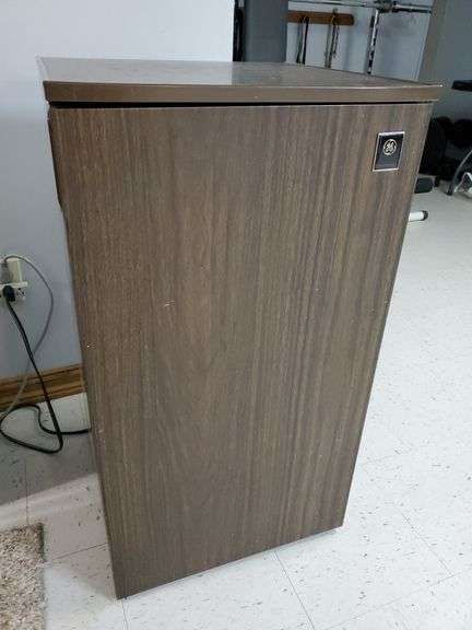 LOT 62 - GE model SC4DLE mini fridge measures 19 in WX 18 in DX 34 in H. Powers on and gets cold. Basement.
