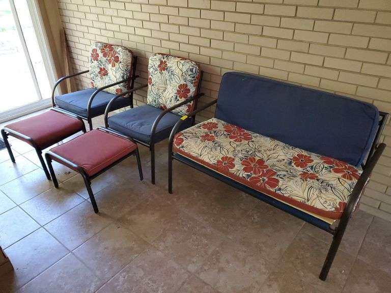 LOT 59A - Metal frame patio furniture including loveseat, two chairs with ottomans. Includes pads. Appears lightly used.