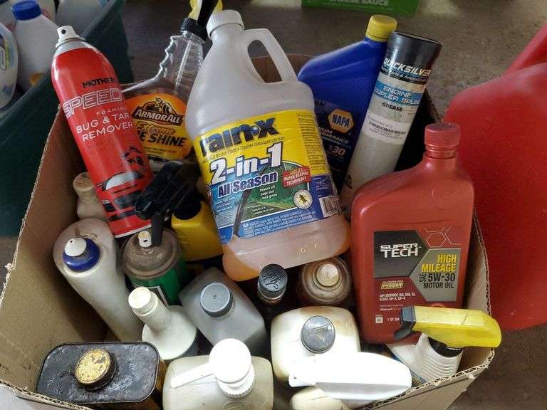 LOT 214 - Automotive products including Rain-X windshield washer fluid, window cleaner, bug and tar remover, armor All, oil and lubricants. Garage
