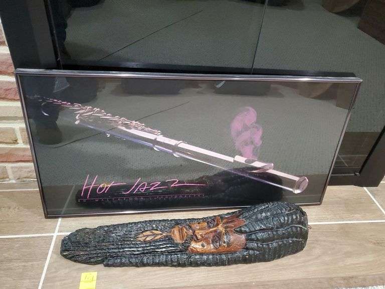 LOT 184 - Wooden hand carved wall decor, framed hot jazz photograph measuring approximately 16 x30. See photos