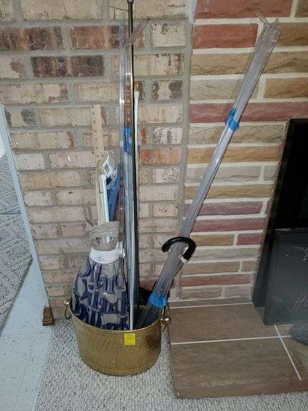 LOT 185 - Decorative brass bucket, curtain rods, umbrella.