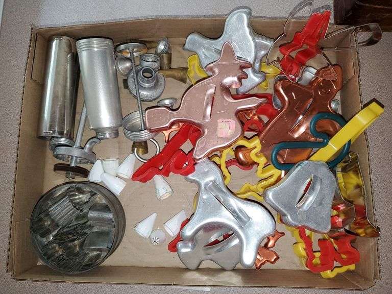 LOT 254 - Assorted vintage and newer cookie cutters, icing decorator kit.
