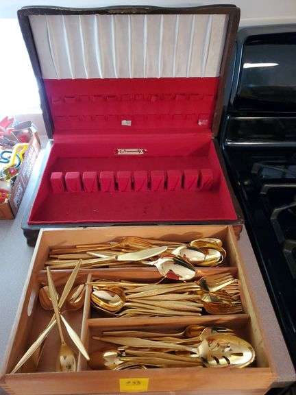LOT 255 - Florentine gold tone flatware with serving pieces good service for eight, Oneida community flatware wooden storage box. No Oneida flatware.