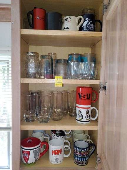 LOT 257 - Kitchen cupboard contents includes iced tea glasses, juice glasses, ceramic mugs featuring YSU, Ohio State and others.