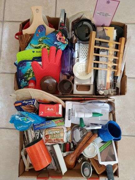 LOT 260 - Kitchen gadgets and items including candy/deep fryer thermometer new in package, cheese grater, Julianne slicer, creamer and sugar bowl, cutting boards, oven mitts, coffee filters, flower sifter, and much more. Kitchen