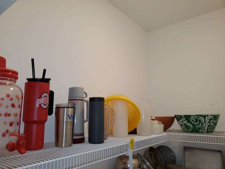 LOT 262 - Top shelf kitchen pantry includes thermos, Stanley travel cup, new Ohio State metal cup, beverage dispenser, pitchers, bowls and more.
