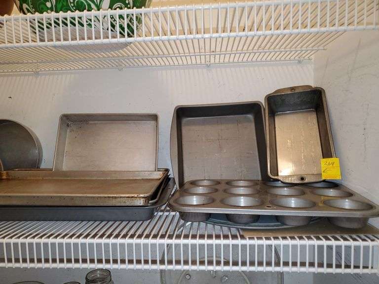 LOT 264 - Bakeware including muffin pans, bread tins, brownie tins, cookie sheets, cake pans and more. Kitchen pantry