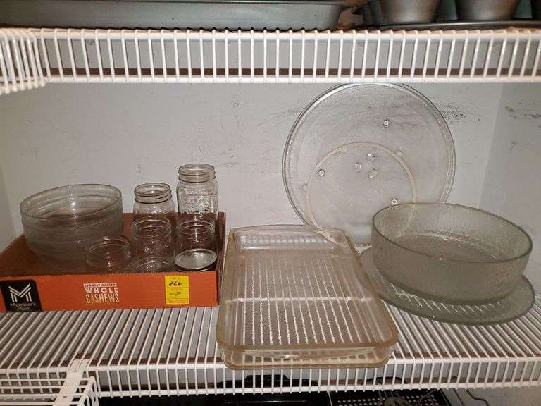 LOT 266 - Vintage glass baked lasagna pan, round microwave carousel plate, canning jars, decorative glass bowl with matching plate. Kitchen pantry