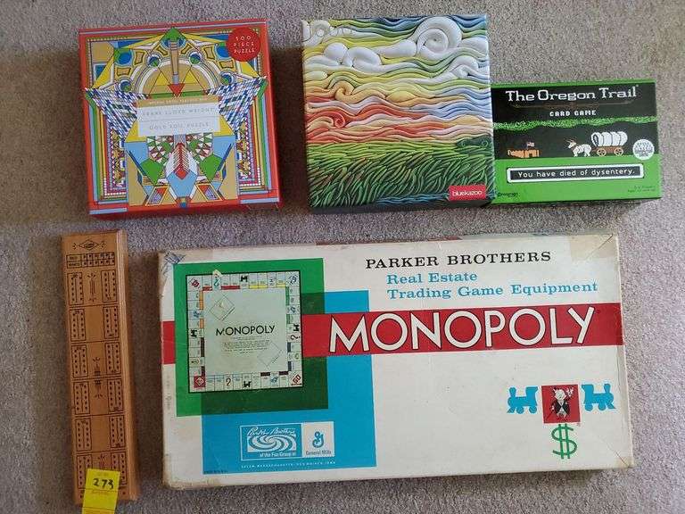 LOT 273 - Frank Lloyd wright gold foil puzzle 500 pieces, 1,000 piece blue kazoo puzzle, the Oregon trail card game, cribbage board, Monopoly game. First floor