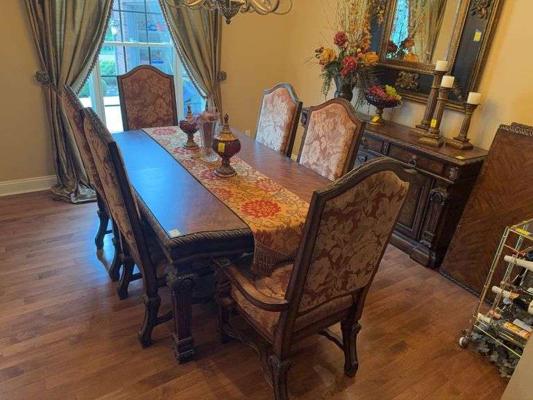LOT 1A - Ashley Furniture Formal Dining Set including Dining Table 72”W x 44”D x 30”H with (2) Leaves (18”W), (2) Captains Chairs and (4) Upholstered Dining Chairs, Beautiful Credenza Buffet Table 70”W x 18”D x 34”H. Includes Table Runner. No other decor included