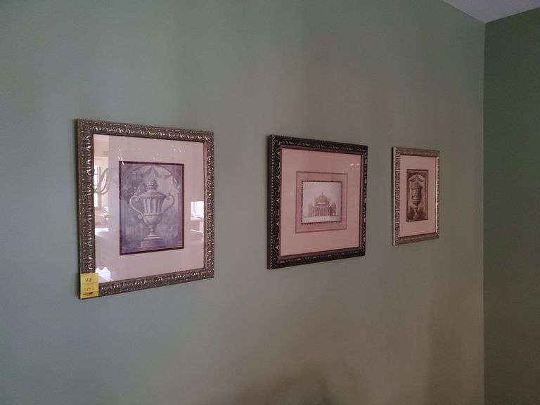 LOT 28 - (3) Bombay artworks including o-le nouvel facade principale, pineapple urn, draped urn. Measure approximately 15-in x 17 in. Dining room