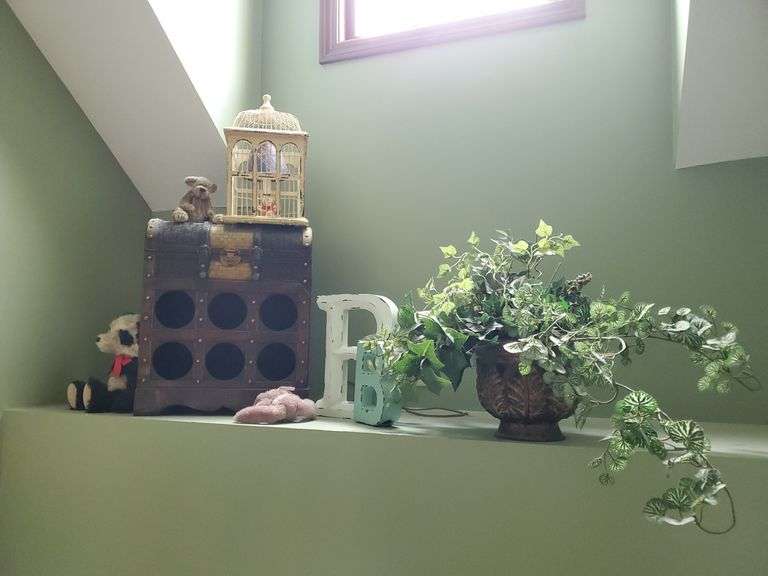 LOT 35 - Vintage wine rack treasure chest (16 in wide X 20 in tall), bird cage (16 in tall), plush bears (1) Bombay, artificial ivy plants in urn flower pot. Front entry