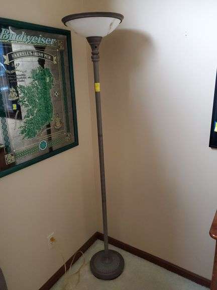 LOT 55 - 72-in tall bronze leg floor lamp with mottled opaque shade. Back office.