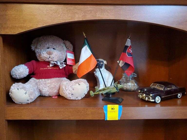 LOT 60 - 1949 Ford diecast car, p38 lightning diecast model, dromoland patch bear, beach sand and shell in a glass bottle, ceramic dog, national flags. Back office