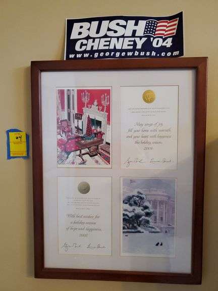 LOT 64 - 2004 and 2005 Christmas cards from the White House with George and Laura Bush signatures in a wood frame, Bush - Cheney 04 bumper sticker. Back office