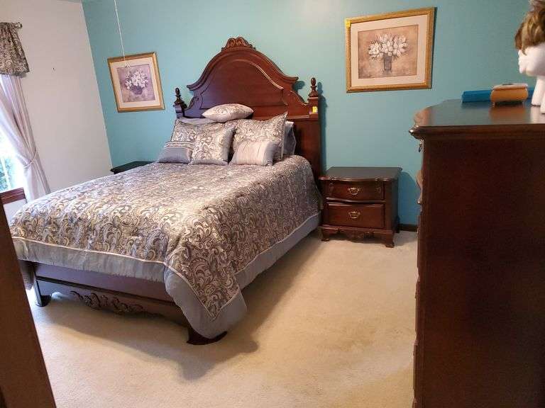 LOT 72 - (5) pc. bedroom suit includes queen bed and Paisley bedding, ornate wood headboard and footboard, chest of drawers with solid brass pulls measures 38 in W X 20 in D 52 in H, mirrored dresser with solid brass pulls in ornate mirror frame measures 63 in W X 19 in D X 84 in h and (2) matching nightstands measuring 26 in W x 18 in D X 24 in H . DOES NOT INCLUDE ANY CONTENTS ON TOP OF THE FURNITURE. See photos. Master bedroom.