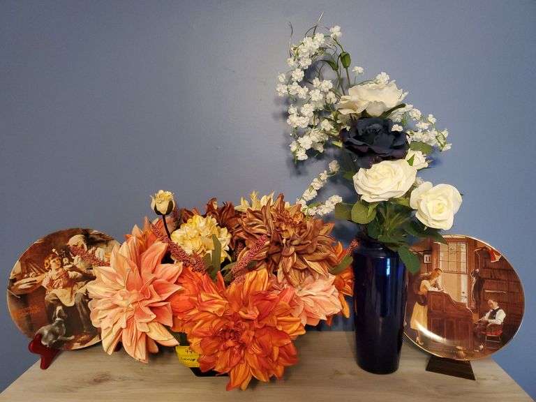 LOT 94 - (2) Norman Rockwell collector plates includes the toymaker, the marriage license, artificial arrangements, (1) in a large swirled glass vase with ruffled edges, one blue glass vase, one square crystal glass vase. Upstairs bedroom. See photos