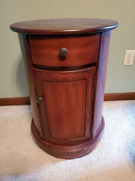 LOT 99 - Nature and Home Trends Company, round end table in Cherry finish with top drawer and lower storage measures 18 in round and 26 in tall.