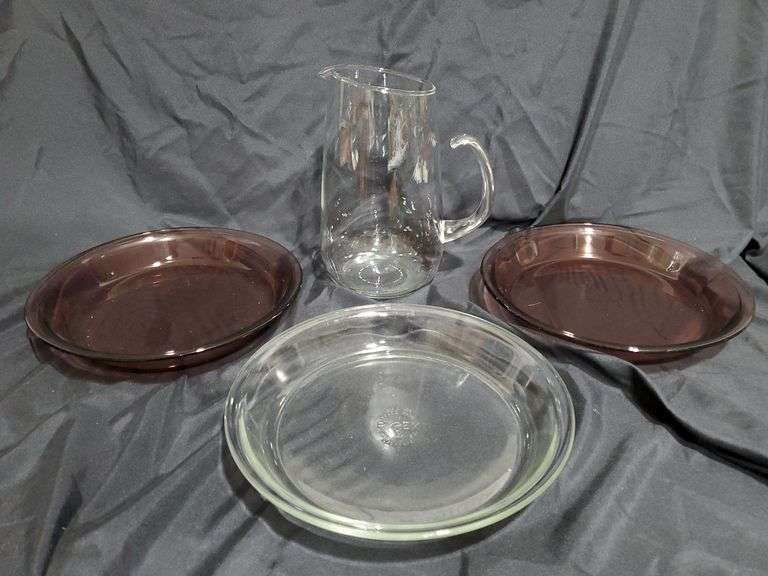 LOT 233 - Pyrex glass pitcher, two colored pie plates, one clear pie plate.
