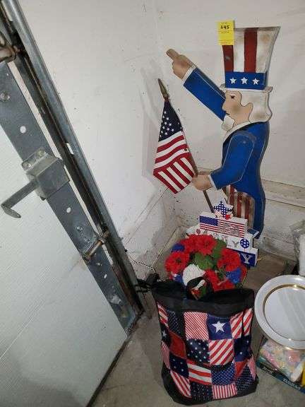 LOT 245 - 4th of July and patriotic decor includes 38-in tall Uncle Sam would cut out, red white and blue artificial flowers, 4th of July plaque, reusable cloth bag.