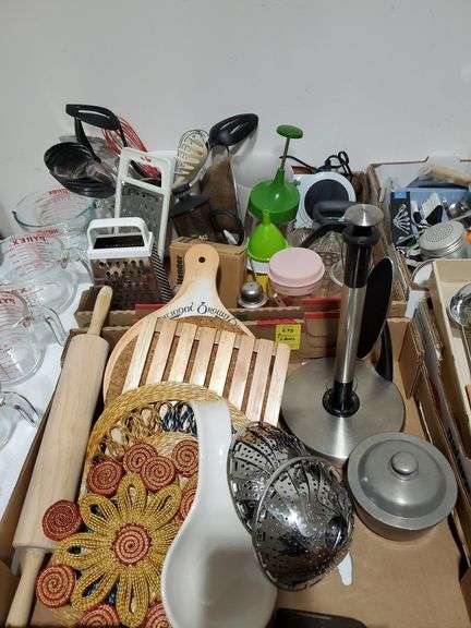 LOT 255 - Kitchen gadgets including rolling pin, trivets, spoon rest, vegetable steamer, paper towel holder, glass honey jar, potato masher, cup warmer, mincers and choppers, pampered chef pastry blender, cheese graters and more.