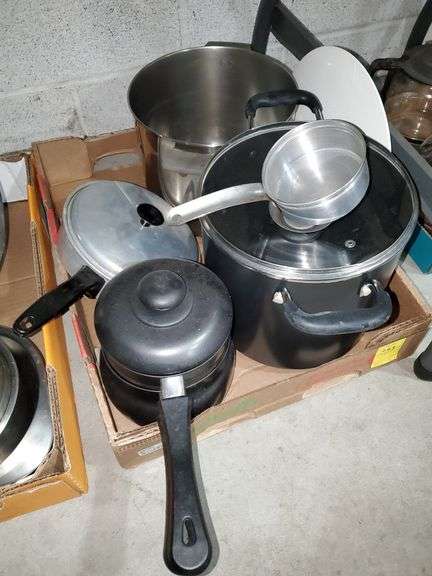 LOT 263 - Assorted stock pots, pans, double boiler.