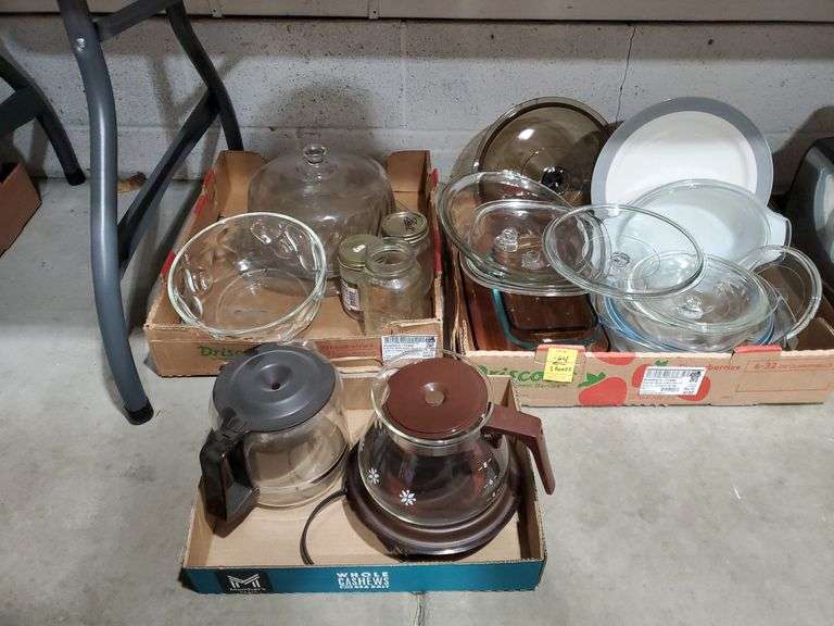 LOT 264 - Pyrex and anchor Hocking rectangular pans and casserole dish, Corning and Pyrex brand lids, vintage glass cake keeper, vintage snack bowl, Mr coffee 10 cup carafe with warming plate and more.