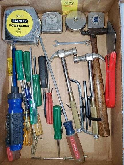 LOT 278 - Vintage round Lufkin tape measure, Stanley tape measure and others, Phillips and flat tip screwdrivers, tack hammers, allen wrenches.