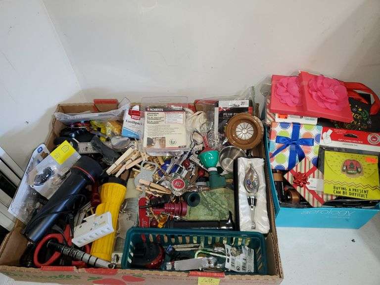 LOT 279 - Kitchen drawer contents including flashlights, keychains, bottle openers, wine bottle stoppers, pocket knife, gift card boxes and bags, batteries and more.