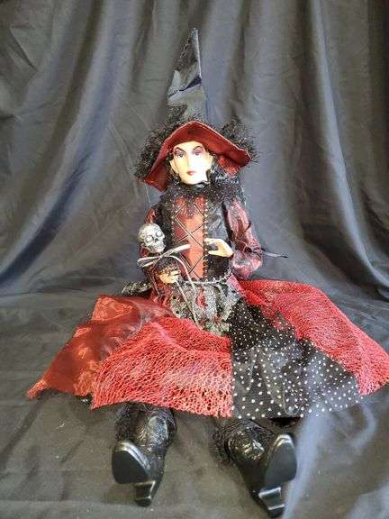 LOT 280 - Broomstick Blvd Halloween Witch Doll Skull Shelf Sitter. 24-in total length.