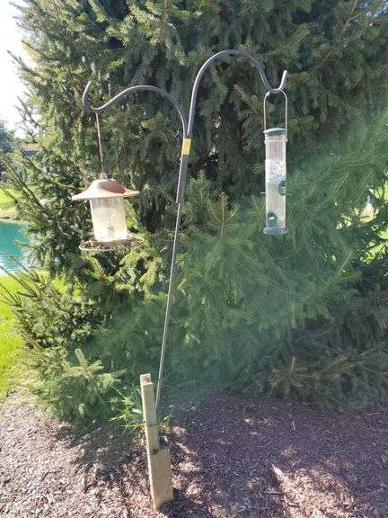 LOT 500 - 70-in tall double hook shepherd's hook with two bird feeders. Backyard