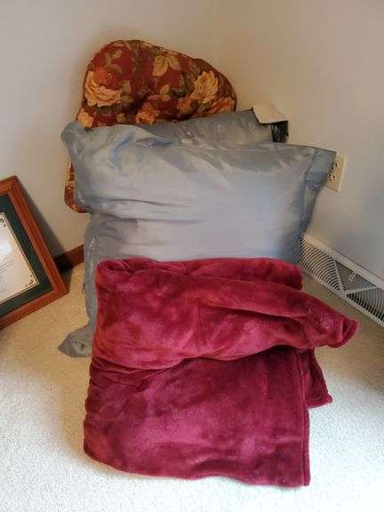 LOT 77A - (2) Large accent pillows, maroon plush blanket, floral upholstered pad. Master bedroom