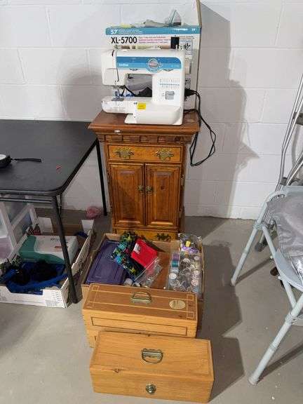 LOT 310 - Brother Sewing Machine XL-5700. Wood Cabinets with contents including sewing supplies