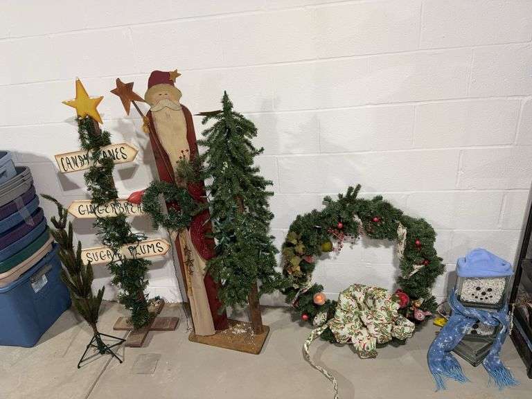 LOT 324 - Assorted Christmas Decor including Standing Santa with Tree, Irish Christmas Tree, Wreath, and Lighted Glass Snowman