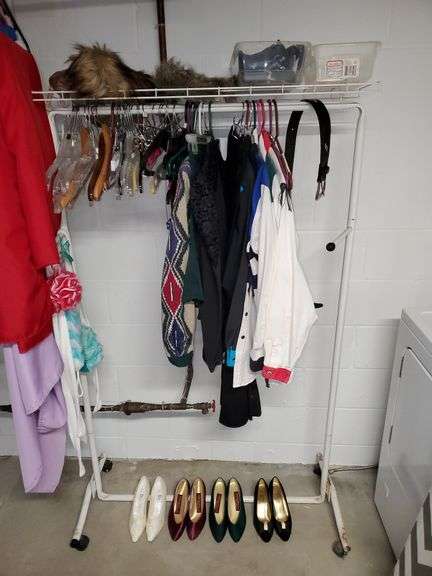 LOT 355 - Women's size 6 shoes by peacocks premier, the PM collection 925, diables by highlights, assorted women's blouses in small size, fur jacket hood and collars, fashion belt and includes clothes rack with hangers.